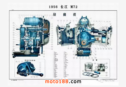 好了,開始講長江750的歷史。20世紀(jì)50年代,在蘇聯(lián)“老大哥”的支援下,我國參照烏拉爾T-72生產(chǎn)造出了我國自己的長江750M1型摩托車。當(dāng)時只知道仿制的是蘇聯(lián)烏拉爾M72,沒有圖紙,只好采取土辦法——拆,把樣車零件統(tǒng)統(tǒng)拆下來,然后實(shí)物測繪。光測繪畫圖紙就用于近3個月,整車完成共651份圖紙,車體部分圖紙編號1308A4,發(fā)動機(jī)部分圖紙編號1800A4。