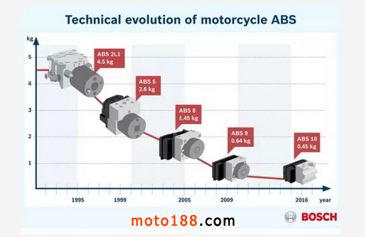 毋庸置疑,ABS是可以降低事故,增加駕駛者安全系數(shù)的。根據(jù)數(shù)據(jù)表明,安裝有ABS系統(tǒng)的摩托車可有效減少1/4的事故率。此次博士的ABS 10追加了更多的偵測頻率以及更高的運(yùn)算效率,使ABS使用的效果更好。而且重量也較前一個(gè)版本減輕了30%,體積縮減了45%,成本也隨之降低,也就是說新版ABS 10更小、更快、更便宜。