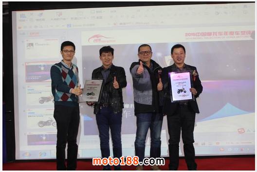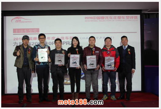 被譽為中國頂級摩托大獎(TOP CHINA MOTOR)的中國摩托車年度車型評選活動日前落幕。12月6日,2015中國摩托車行業年度車型評選頒獎盛典在西安隆重舉行,來自中國汽車工業協會摩托車分會、國家摩托車質量監督檢驗中心的領導、專家以及國內十一家一線摩托車企業代表、行業媒體代表和全國俱樂部代表、車迷代表共200多人參與本次盛會。頒獎典禮上,2015中國摩托車十佳車型獎,以及創新、時尚、動力、運動等五個獎項,16款車型17項大獎一一揭曉。