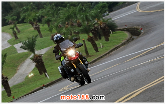 彎道操控性就是多功能車的強(qiáng)項(xiàng)!V-Strom配置前倒叉后多連桿懸吊系統(tǒng),加上前雙輻射卡鉗煞車后,入彎重煞準(zhǔn)確,彎中的穩(wěn)定度表現(xiàn)也很不錯(cuò),而且因?yàn)檐囕v引擎管理系統(tǒng)有諸多控制元件,所以彎中補(bǔ)油時(shí)車輛反應(yīng)也不會過于突兀造成動態(tài)不穩(wěn),不過也許是因?yàn)檐囍剌^重,或者是車體因?yàn)椴捎肰型雙缸擺設(shè)原因,所以中心較高的緣故,出彎時(shí)會比較需要多一點(diǎn)的力量來回到直線,油門的掌握變得更為重要。