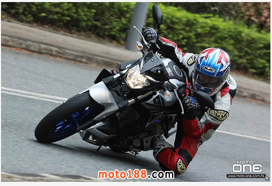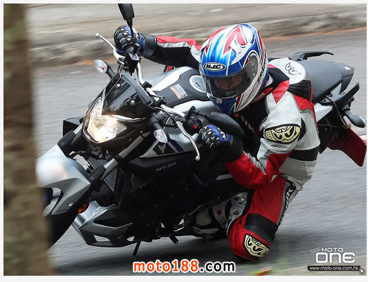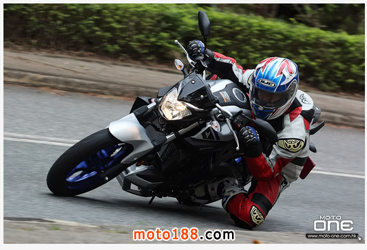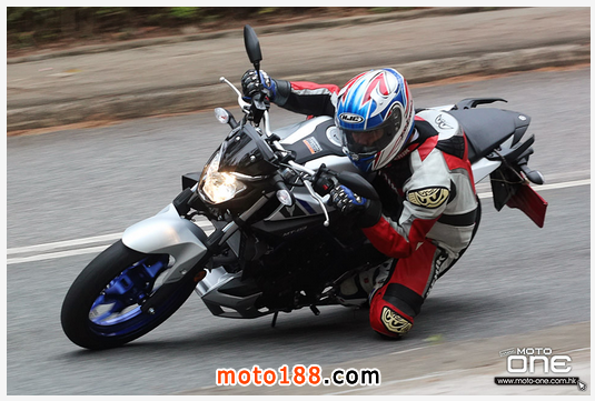 至於MT-03對開慣大排跑車的李有昌來說,42ps馬力當然沒法滿足他的要求,然而 入門車提供的靈活轉向反應是騎士最喜歡的共通點。李有昌說雖然MT-03輕巧細小,但無須屈手屈腳卷縮身體駕駛,即使相對畢直但舒適的座姿(現時NK車流 行輕微俯伏模仿大包圍座姿),配合闊度適中的轪把,雙臂沒有被撐開的感覺,在搬身過彎時上身感到很自然及輕易,即使彎速絕不下於大排跑車,而設定適中的腳 踏在較低傾則角度過彎時也不會磨腳踏。