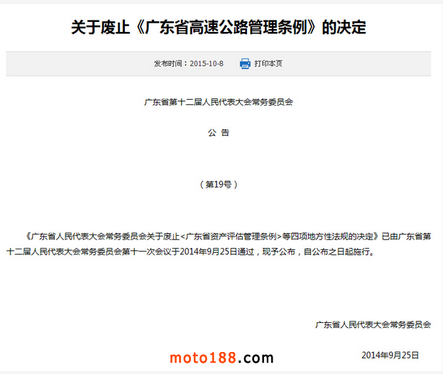 核心提示: 因與國家相關法規沖突,廣東省禁止摩托車上高速的地方條例《廣東省高速公路管理條例》已于2014年9月25日被廣東省人大廢止,現