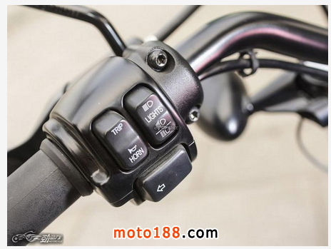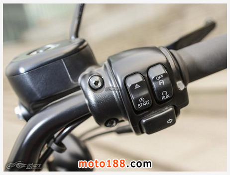 再來看看車把上的控制開關,別的都算正常,只是轉向燈的控制開關是左右分開的,左手控制左轉向燈,右手控制右轉向燈,按一下亮起,再按一下關閉。這樣的控制方式寶馬以前也用過,現在應該只剩下哈雷和效仿它的錢江巡航者還在用了。好不好用,關鍵是看能不能習慣。
