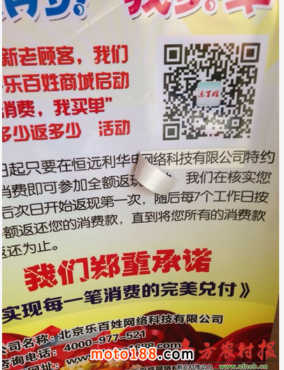 11月30日,云浮新興縣陽(yáng)光明媚,沿江北路的雅馬哈專賣店內(nèi),不少人進(jìn)店咨詢、看車。店的正中醒目的海報(bào)上,“為答謝新老顧客,我們將攜手樂(lè)百姓商城啟動(dòng)‘您消費(fèi),我買單’消費(fèi)多少返多少。” “活動(dòng)18號(hào)開(kāi)始,反響非常熱烈。”雅馬哈泓輝店的銷售黃經(jīng)理表示,“這種網(wǎng)絡(luò)平臺(tái),我觀察三年了,終于還是決定做,這對(duì)車主來(lái)說(shuō),是絕對(duì)不會(huì)虧本的。” 據(jù)了解,消費(fèi)者在店里購(gòu)車后,與樂(lè)百姓平臺(tái)簽個(gè)協(xié)議,就可以每7個(gè)工作日獲得商品價(jià)格0.76%的返款,約3年半時(shí)間內(nèi)全部返還100%車款。 “錢(qián)是通過(guò)支付寶轉(zhuǎn)賬的,基本什么銀行都可以,很方便。”黃經(jīng)理向記者展示了還款短信。 按照活動(dòng)的算法,雖然還款周期有3年之久,但幾乎等同于“0元購(gòu)車”,且人人有份,優(yōu)惠幅度超出了目前市面上所有的促銷活動(dòng)。 但記者從其他商家處了解到,該店每筆交易要參與活動(dòng),商家需向平臺(tái)支付銷售額16%的費(fèi)用。“雅馬哈店內(nèi)的車,很多都加價(jià)賣。” 但黃經(jīng)理強(qiáng)調(diào),“16%的費(fèi)用是由商家支付,消費(fèi)者不會(huì)虧本。” 公司資質(zhì)存疑問(wèn)
