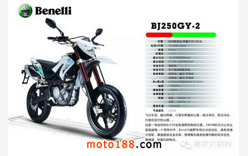2016年1月貝納利BJ250GY-2越野滑胎新車上市,南京貝納利專賣店可以接受預定,售價18800元,整車顏色有白黑兩種,技術參數如下:最大馬力18KW,最大扭矩18N.M,電子燃油噴射系統,前后盤式剎車,長*寬*高尺寸2230mm*860mm*1210mm,軸距1450mm,座高900mm,凈重140KG,油箱容積6.1L,前輪100/80-17,后輪130/70-17,最高車速135km/h