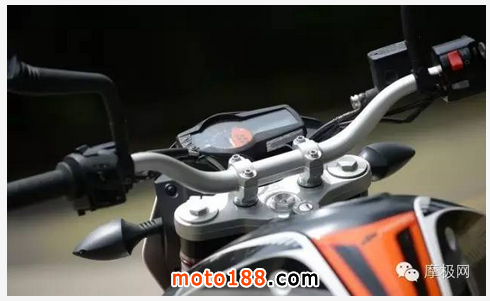 精簡的數(shù)碼儀表搭配上指針轉(zhuǎn)速與多燈號顯示器的組合,可以說是“麻雀雖小,五臟俱全”,儀表上方也少了過去街車常見的車頭整流罩或者小風(fēng)鏡,在大太陽下判讀可能要稍稍閃避強烈的反射光線了。裸露的車手把,中間刻印上KTM的字樣,帶有噴砂質(zhì)感的車手把相當?shù)赜匈|(zhì)感。與前叉配色選用相同的涂裝,手把上方有刻度環(huán),可以提供騎士做細節(jié)上的調(diào)整車手把角度。把手材質(zhì)采用鋁合金的材質(zhì),KTM Duke 690選擇Magura的異徑把手,在強度與手感上都能兼顧,同時把手轉(zhuǎn)向角度高達63.5度,這對于許多街跑車來說是夢寐以求的角度,也因此大大增加了Duke 690的靈活性。