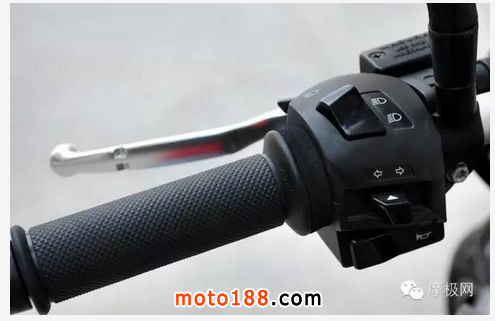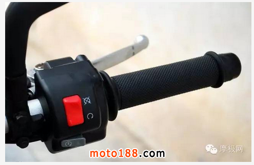 右側(cè)把手開關(guān),主要的引擎熄火開關(guān)跟下方的電發(fā)開關(guān),塑料的材質(zhì)搭配黑色烤漆,簡單明了。握把采用顆粒的防滑握把,抓握起來軟硬適中,不會有過硬或者偏軟容易磨耗的問題。