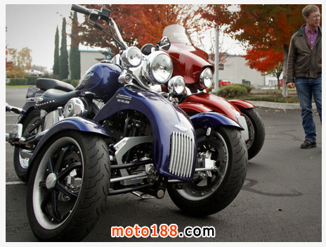 Mighell最初的改裝想法來自比亞喬的Mp3,可傾斜三輪摩托車獨有的平衡性和可操控性給他留下了深刻的印象。于是,他想到了哈雷,哈雷固然霸氣,但它的自重更是霸道,一般人還真不好駕馭。
