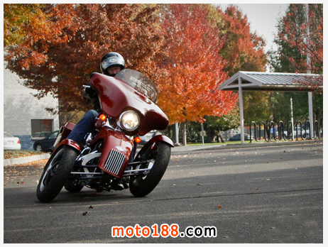 Mighell的做法是,發(fā)明了一個獨特的兩輪轉(zhuǎn)換裝置,據(jù)稱,該裝置目前已經(jīng)適用于哈雷其他幾款旅行車和本田的金翼等。兩輪轉(zhuǎn)向為聯(lián)動可傾斜,制動方面用的是13英寸的盤式液壓制動。
