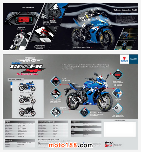 Suzuki 自 2014 年起向印度市場發布了采用風冷四沖程單汽缸、OHC 兩汽閥發動機的、街車造型的 Gixxer 155。而在剛過去的 2015 年,經過了在當地舉辦單一車型的 Gixxer 杯錦標賽之后,廠方在原有產品的基礎上、進一步發布了全包圍的 Gixxer SF 跑車版。