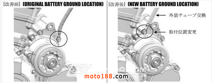 另外一個問題是腐蝕物質還會對電池電線與曲軸箱的連接產生影響,使電源發生故障,導致發動機無法正常啟動或關閉。為此鈴木將為連接線加裝保護膜,并更換電池電線與曲軸箱的連接位置,保證發動機正常運行。