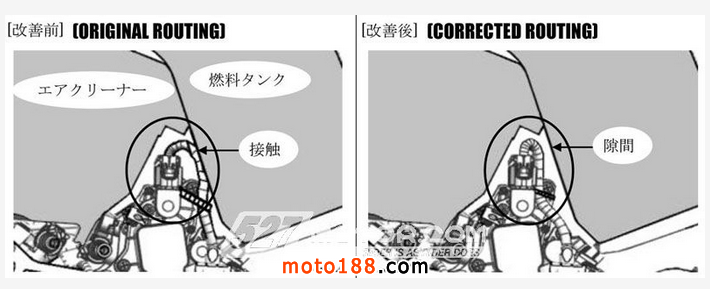 第三個問題是2014-2016年車型的電線與油箱底部距離太近,摩托車正常行駛中的震動會使電線的絕緣層磨損,導致電線與油箱接觸造成短路,并引發發動機停滯。鈴木經銷商將會對召回車型的電線進行檢測,如有必要將對線束重新安置,擴大線束與油箱之間的空隙,如果裸線露出,鈴木將更換掉全部電線。