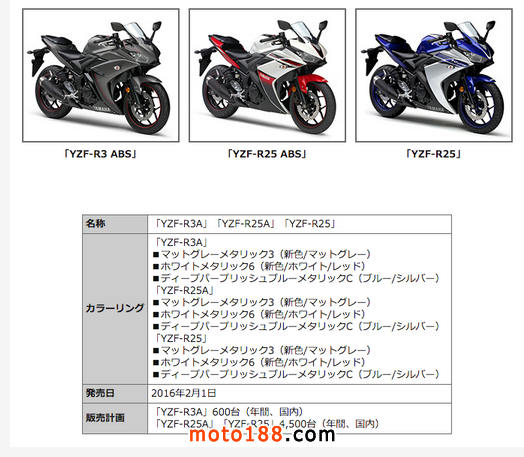 日本YAMAHA公司于2016/1/12宣布,即將在2016/2/1號發(fā)表即將推出R3 & R25的新配色
