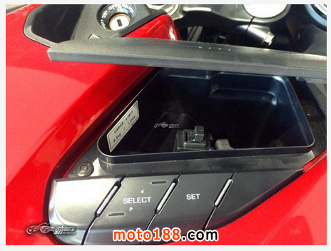油箱罩上有兩個(gè)小型儲(chǔ)物盒,放一些票據(jù)和零錢還是很方便的。并且各個(gè)功能按鍵都設(shè)計(jì)的比較大,騎士帶著手套也能進(jìn)行準(zhǔn)確的觸控。