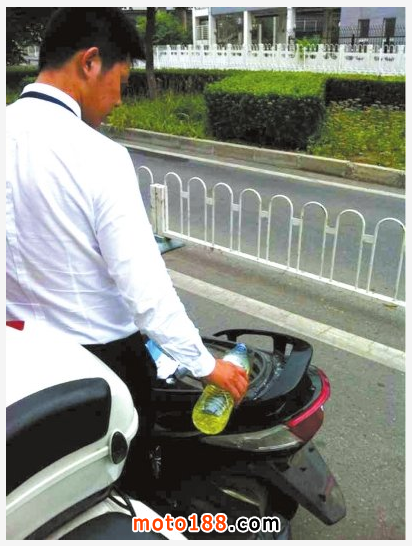 按規(guī)定,未成年人小金不僅不能騎摩托車,且加油站也不應該給無牌摩托加油。那么,小金是從哪里獲得汽油的呢。小金說,很多騎“黑摩托”的人都知道,一些路邊修車鋪出售散裝汽油。小金說,他平時騎摩托上下學,小街橋附近有一處修車鋪就出售散裝汽油。“一般一次就買一瓶汽油,用礦泉水瓶裝著,每瓶1.5升,加一次能跑幾十公里。”小金說。