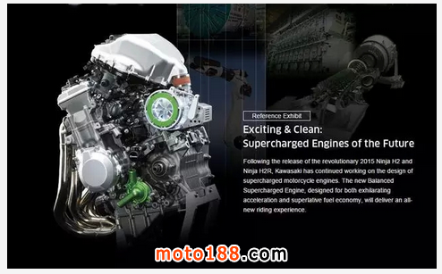 KAWASAKI在2013年日本東京車展展出機(jī)械增壓的并列四缸發(fā)動(dòng)機(jī)后,使外界期待大作的面世。幸好,KAWASAKI并沒有讓車迷失望,在2014年9月30日正式發(fā)布配上機(jī)械增壓發(fā)動(dòng)機(jī)的H2及H2R。在2015年的東京車展上,KAWASAKI展出一臺(tái)名為KAWASAKI Balanced Supercharged Engine Concept的概念發(fā)動(dòng)機(jī),驟眼看與H2及H2R的四缸發(fā)動(dòng)機(jī)分別不大,細(xì)心看官方的簡(jiǎn)短介紹影像才發(fā)現(xiàn)在機(jī)械增壓部位增加了類似搖臂的機(jī)件,作用是控制扇葉的開啟角度,即是說(shuō)電腦根據(jù)車速及轉(zhuǎn)數(shù)等數(shù)據(jù),控制機(jī)械增壓的入風(fēng)量及流速,以達(dá)到KAWASAKI描述發(fā)揮發(fā)動(dòng)機(jī)最大效率同時(shí),也可做到省油,這功能與可變氣門有異曲同功之妙,可是廠方?jīng)]有公布新發(fā)動(dòng)機(jī)的排氣量及細(xì)節(jié)。