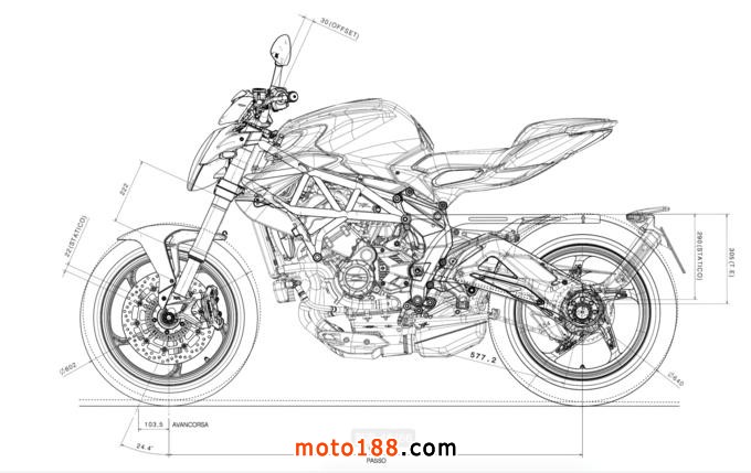 由此圖可以發現,MV AGUSTA工程師為了求得更好的過彎穩定性,將前叉頃角略為加大。為了彌補加大頃角后來帶來的神經質,于是降低車輛軸線及更動后搖臂角度,讓軸距也由前代的1380mm增加至1400mm,造就穩定度及靈活性兼具的操控性格。