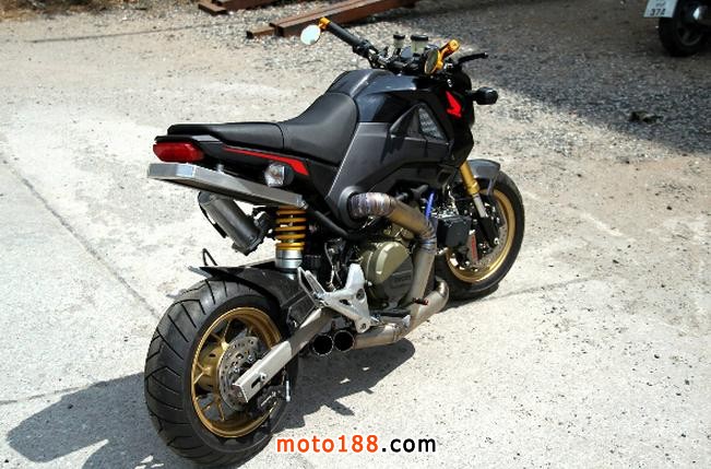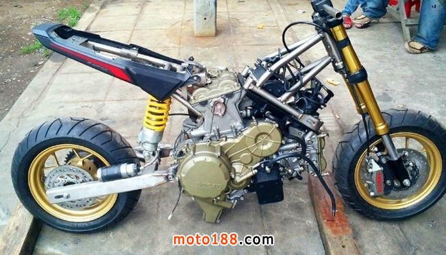 來自摩托網站 Bikethrottle.com 的報道,外國一工程師在一部以 Honda MSX125 為基礎車體的摩托車里,塞進了一副最大馬力輸出高達 205 匹的杜卡迪 Panigale “ 帕加尼 ” 發動機,強化了的懸掛和制動系統也顯而易見。而這部改裝之后制成品,被稱之為 MSX MOD DAM,而這部車或許算得上是有史以來、動力最為強大的迷你摩托。