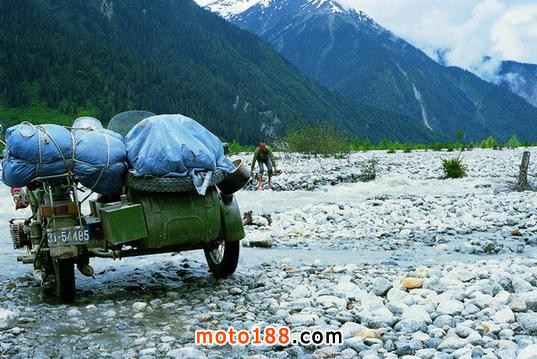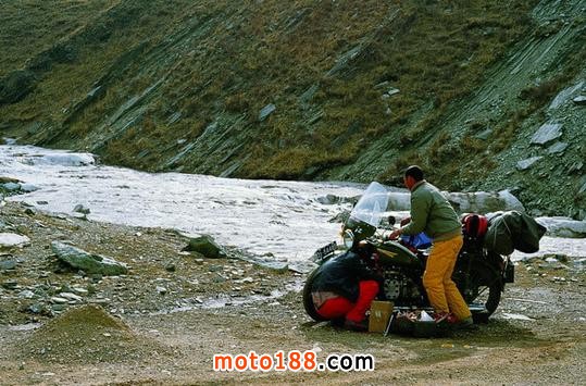 一輛摩托車坐三個人,還要帶3個大睡袋,睡袋和羽絨服都是四川一個羽絨服廠贊助我們的,因為據說是廠長的弟弟去美國是何的朋友給做的擔保,睡袋很大直徑有30公分,還帶了頭盔帳篷瓦斯爐還有一些修車配件,頭盔帳篷瓦斯爐是何飛到香港采購的,為了能過帶上足夠的汽油,請人在摩托車中間加了一個1.7米長的副油箱,由于沒有聽說過高反,我們只帶了感冒藥和治拉肚子啥的藥,最多是帶上了一些蜂王漿膠囊,出發那天我們整整裝了一天車,東西太多車太小,我坐在跨斗里,腳下放著東西,懷里也抱著東西。