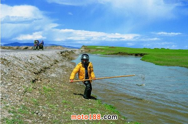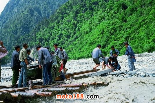 我們過完險路到達了河邊,但是橋已經被水沖毀,前邊過去的車給道班工人錢,工人們修了一座臨時橋,那車過去后工人拆掉幾根木頭,后來的車想過還得付錢,我們的車小,給道班工人200元(貌似是的),請他們把摩托車抬過去,抬車過河的時候,張一不小心掉進河水,雖然他水性很好,轉眼湍急的水流就把他沖出去好遠,何當時立即跳入水里,幫他爬上岸來。