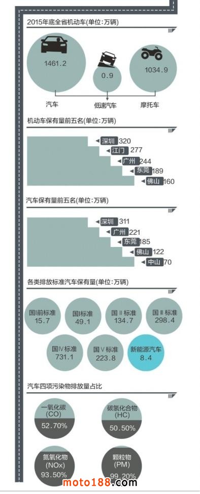 年報顯示,截止到2015年年底,全省機動車保有量達到2521.4萬輛,比2014年增加5.7%。其中汽車1461.2萬輛,摩托車1034 .9萬輛。全省機動車保有量較大的城市主要集中在珠三角地區,前五位依次是深圳、江門、廣州、東莞和佛山,其中,深圳達到320萬輛,江門277萬輛,廣州244萬輛。
