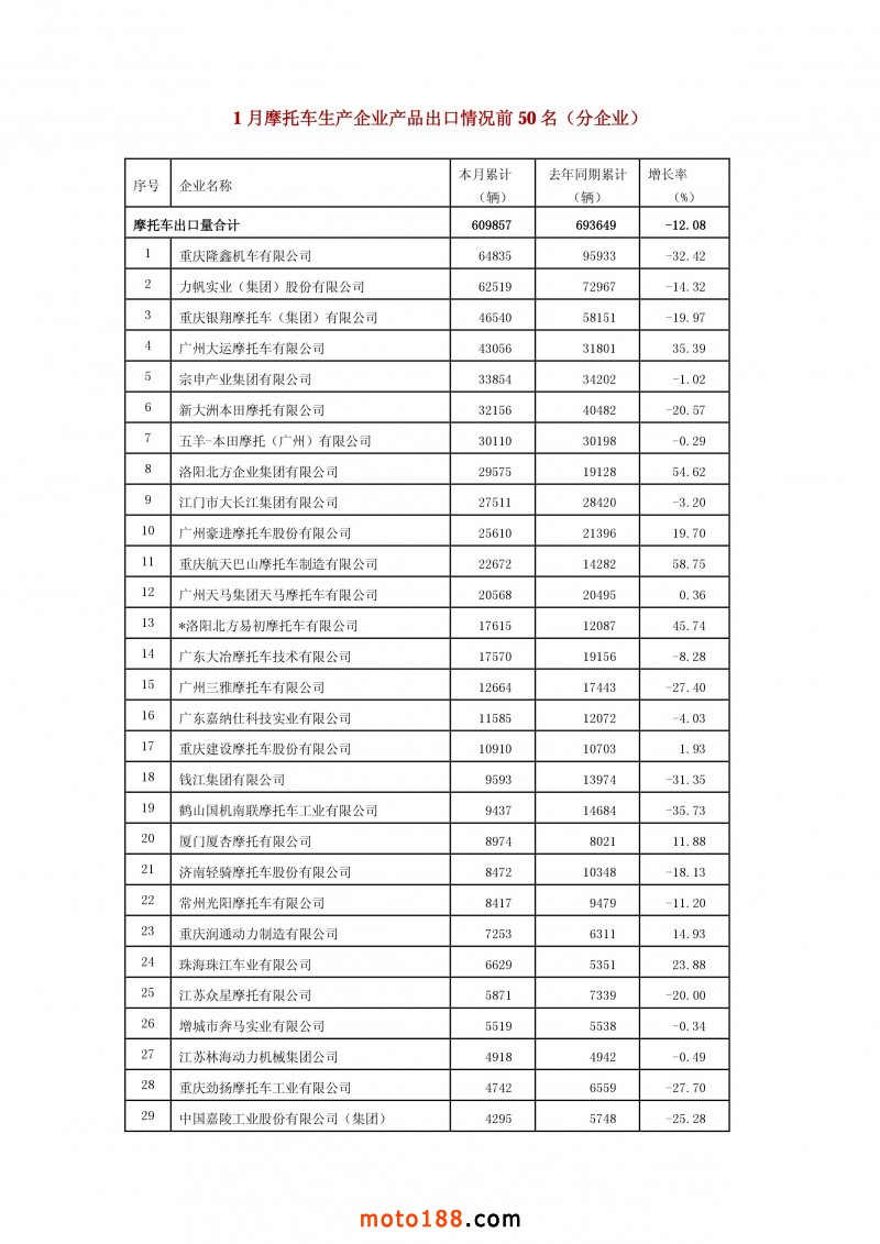 核心提示:2017年1月摩托車生產企業產品出口情況