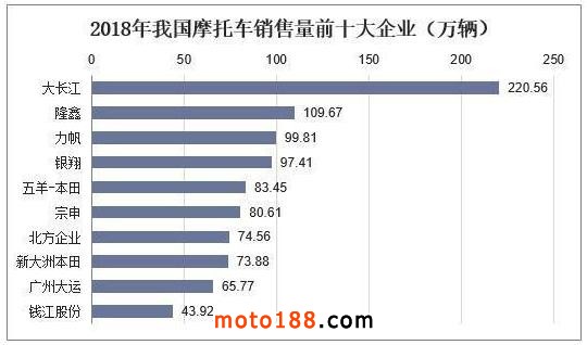 目前中國摩托車生產企業主要集中在重慶、廣東、江浙這三大板塊,我國摩托車行業非常突出的一個結構特點是民營企業為主導,國有和外商投資為輔,國內生產企業前20家企業市場總占有率超過75%。2018年我國摩托車銷售量排名前十家企業為大長江、隆鑫、力帆、銀翔、五羊-本田、宗申、北方企業、新大洲本田、廣州大運和錢江股份,其中大長江以220.56萬輛的年銷量穩占第一的位置,是銷售量排名第二的企業隆鑫的兩倍,隆鑫、力帆2018年摩托車銷售量分別為109.67萬輛、99.81萬輛。