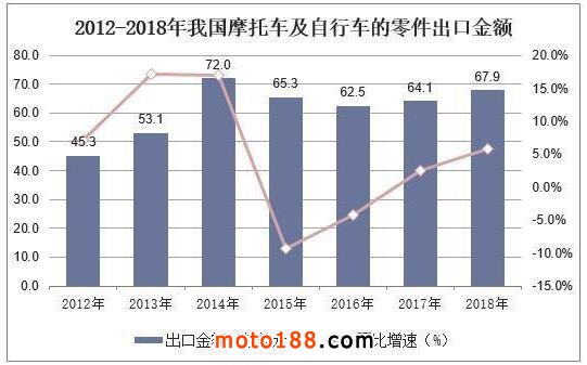 2012年國內摩托車市場萎靡,摩托車出口也受到了匯率,印度崛起,出口國政治局勢不穩等的持續影響,2012年我國摩托車出口數量同比下滑14.2%。近幾年來我國摩托車出口才開始出現較為穩定的增長態勢,2018年我國摩托車出口數量2185萬輛,同比增長9.8%。2015-2018年我國摩托車及自行車的零件出口金額較為穩定,維持在65億美元左右,2018年出口金額為67.9億美元,同比增長5.8%。