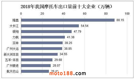 從出口企業來看,2018年我國摩托車生產企業出口量排名前10位的依次為:隆鑫、大長江、銀翔、力帆、宗申、廣州大運、新大洲本田、五羊-本田、廣州豪進和航天巴山,同比2017年,其中隆鑫和大長江出口量增速最快,2018年出口量分別排名第一、二名,出口量為88.15萬輛、54.54萬輛。