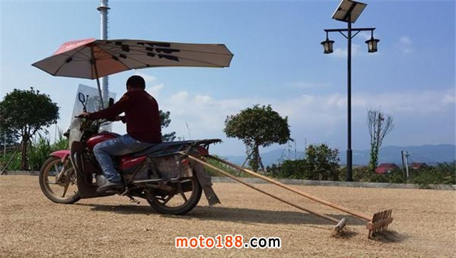 為搶住好天氣,曬谷時,他想了個新招:將兩個翻谷耙綁在摩托車上,駕著“坐騎”,不急不緩地在曬坪上翻谷。“以前,曬谷時,要安排專人負責,現(xiàn)在在送谷的間隙,就能翻一次,不必安排專人,而且翻曬更加均勻,工作效率至少提高3倍以上,人也輕松。”林平說。