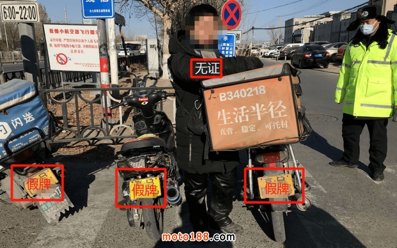 先是一輛送外賣的兩輪摩托車被民警攔住,當民警要求駕駛人于某出示駕駛證時,于某承認自己根本沒有駕駛證。民警通過對于某的身份信息進行核查,證實于某確實沒有駕駛證。而在對其所駕車輛進行車檔信息核查時發現,其車牌也是偽造的。