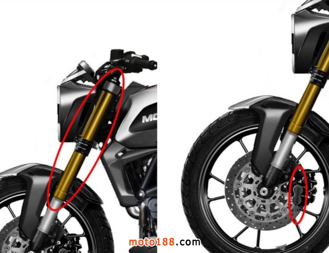我們再看看這款車型,外觀非常有特點。減震與剎車使用了黃金色的前倒置減震和雙碟剎剎車,聯想到X-CAPE 650的布雷博卡鉗和馬祖奇減震,相信這款車的減震性能與剎車性能可以令大家放心。加上莫里尼和歐洲知名配件廠商的良好合作關系,繼續使用brembo卡鉗問題也不大,但根據最近幾年的復古車發展趨勢來看,輕量化與提升操控也是相當重要的因素。