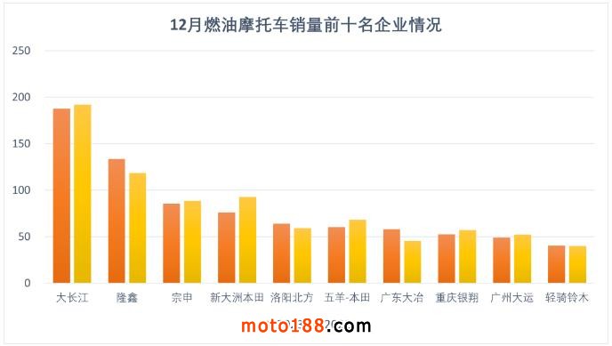 1-12月,燃油摩托車銷量前十名企業(yè)(集團(tuán))為大長江、隆鑫、宗申、新大洲本田、洛陽北方、五羊-本田、廣東大冶、重慶銀翔、廣州大運(yùn)、輕騎鈴木,分別銷售187.74萬輛、133.52萬輛、85.54萬輛、76.13萬輛、63.93萬輛、60.26萬輛、57.88萬輛、52.54萬輛、49.03萬輛和40.23萬輛。