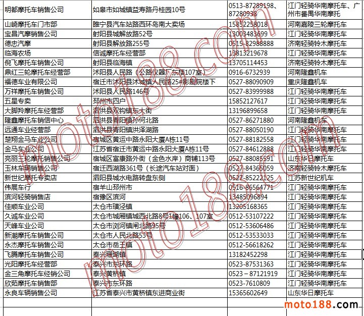 江蘇省摩托車整車經銷商名錄