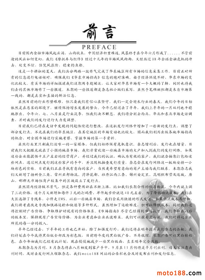 本期雜志為月刊,8月雜志將在八月初發到客戶手中,9月至11月仍將是半月刊出刊。請大家注意出刊時間,及時去發行網點領取雜志,我們moto188網站的公告欄也會及時發布出刊和發行信息。