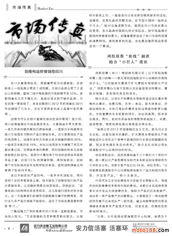 華東市場(chǎng)對(duì)我們來(lái)說(shuō)總體感覺(jué)是:每況愈下,盡管這樣也有許多優(yōu)秀的企業(yè),優(yōu)秀的商戶(hù),他們?cè)谶€堅(jiān)持,在千方百計(jì)的拓展市場(chǎng),既是為了生存和發(fā)展也是為了一項(xiàng)事業(yè)。在物欲橫流、人心浮燥的外部環(huán)境下,行業(yè)有這樣的守望者,行業(yè)也會(huì)生生不息、綿延不絕。隨著東部市場(chǎng)淡季的結(jié)束,他們也會(huì)進(jìn)入到收獲期。假如你有疑問(wèn),那么在十月金秋南京的秋摩會(huì)上,你會(huì)感受到這份努力的果實(shí),這份執(zhí)著而帶來(lái)的回報(bào)。行業(yè)的總體盤(pán)子在不斷擴(kuò)大,摩托車(chē)后市場(chǎng)的作為也越來(lái)越大,這是優(yōu)勝劣汰的進(jìn)化過(guò)程,進(jìn)化的結(jié)果是強(qiáng)者越強(qiáng),在困難時(shí)候能堅(jiān)守的必定是未來(lái)的成功者。當(dāng)然那些轉(zhuǎn)身離開(kāi)者也未必都全是失敗者,會(huì)有新的商機(jī)靠他們?nèi)ゲ蹲剑灰谇趹⑻ぬ?shí)實(shí)地努力,天道也會(huì)酬勤。