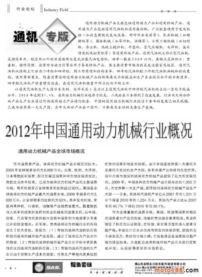 摩托車(chē)與配件》雜志為小型汽油機(jī)專輯,這似乎與摩托車(chē)配件不太相關(guān),但我們還是用心地去組織了與通機(jī)行業(yè)有關(guān)的技術(shù)、標(biāo)準(zhǔn)及資訊類的文章。我們編纂這個(gè)專輯也是有以下各方面的原因: