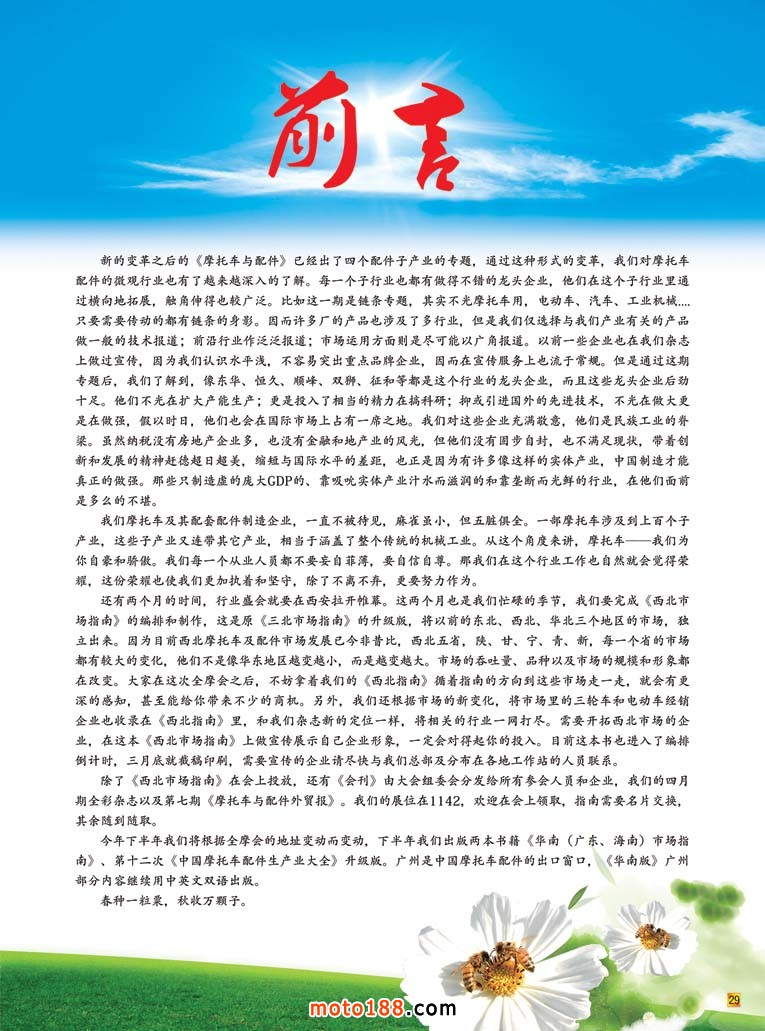 還有兩個月的時間,行業(yè)盛會就要在西安拉開帷幕。這兩個月也是我們忙碌的季節(jié),我們要完成《西北市場指南》的編排和制作,這是原《三北市場指南》的升級版,將以前的東北、西北、華北三個地區(qū)的市場,獨立出來。因為目前西北摩托車及配件市場發(fā)展已今非昔比,西北五省,陜、甘、寧、青、新,每一個省的市場都有較大的變化,他們不是像華東地區(qū)越變越小,而是越變越大。市場的吞吐量、品種以及市場的規(guī)模和形象都在改變。大家在這次全摩會之后,不妨拿著我們的《西北指南》循著指南的方向到這些市場走一走,就會有更深的感知,甚至能給你帶來不少的商機。另外,我們還根據(jù)市場的新變化,將市場里的三輪車和電動車經銷企業(yè)也收錄在《西北指南》里,和我們雜志新的定位一樣,將相關的行業(yè)一網打盡。需要開拓西北市場的企業(yè),在這本《西北市場指南》上做宣傳展示自己企業(yè)形象,一定會對得起你的投入。目前這本書也進入了編排倒計時,三月底就截稿印刷,需要宣傳的企業(yè)請盡快與我們總部及分布在各地工作站的人員聯(lián)系。