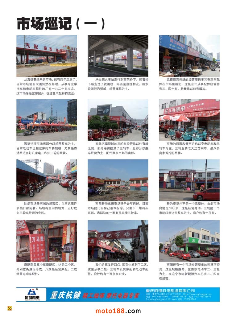 我們雜志在五月份對版面進行了微調,摩托車、電動車、通機等按一定的比例選材編排《摩托車與配件》的外延已經展開,涉及到我們配件行業的相關企業。通過我們對中南地區及華東市場的走訪,我們更加感覺我們調整的及時,緊貼市場。目前摩托車行業在華東地區變化非常大,有昨日黃花之感覺,一些我們以前了解的大戶,曾經門庭若市,現在卻門庭冷落車馬稀,有的不堪門面費用,已轉到倉儲用大篷車送貨銷售。相比而言,中南地區市場變化不算大,在經營數量上還略有增加。摩托車整車市場變化超過了我們配件市場,除了摩托車整車十大品牌還依然屹立,一些小品牌在市場已經很少能看見。這些撤走的小品牌車的門店,變成了電動車和三輪車的門面了,有的甚至是電動四輪車。一些企業稱這些車是新能源汽車,能源肯定是新的,但是作為汽車也稍微寒磣了一點吧。盡管如此,有的地區已經呈現出將要成市的勢頭,但愿這類車在二三線城市不要遭受摩托車的命運。