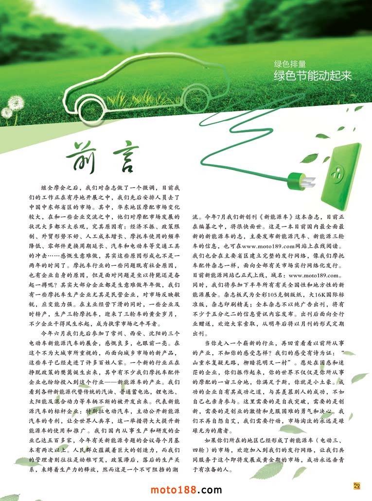 今年六月我們先后參加了常州、西安、沈陽的三個電動車新能源汽車的展會,感慨良多,也眼前一亮。在這個不為大城市所重視的,而面向城鄉市場的新產品,這些車子已經走進了許多百姓人家。一個新的行業正在掙脫政策的樊籬誕生出來,其中有不少我們摩托車配件企業也紛紛投入到這個行業——新能源車的產業。我們看到各種新能源代替傳統的汽油、普通蓄電池,鋰電池、太陽能及混合動力等車輛不斷的被開發出來。代表新能源汽車的標桿企業:特斯拉電動汽車,主動公開新能源汽車的專利,讓全世界人共享,這一舉措將大大提升新能源車的使用和推廣。我們國內從事生產和研發的企業已達五百多家,今年有關新能源專題的會議每個月基本有兩次以上。人民群眾蘊藏著巨大的創造力,而我們的管理者則往往是幼稚可笑,政策滯后,落后的生產關系,束縛著生產力的釋放,然而這是一個不可阻擋的潮流。今年7月我們新創刊《新能源車》這本雜志,目前正在編纂之中,將很快面世。這是一本目前國內最全面最新的新能源車的志,主要發布新能源汽車、新能源三輪車的信息,也可在www.moto189.com網站上在線閱讀。我們也會在主要省區建立完整的發行網絡,像我們摩托車配件雜志一樣,面向全部有關市場實行網絡化發行。目前新能源網站已正式上線,域名:www.moto189.com。同時,我們將參加下半年所有有關全國性和地方性的新能源展會。雜志板式為全彩105克銅版紙,大16K國際標準版,雜志印刷精美;全本雜志不以純廣告出刊,將有不少于五分之二的信息資訊內容發布。出刊后面向全行業贈送,歡迎大家索取,從明年后將以月刊的形式定期出刊。