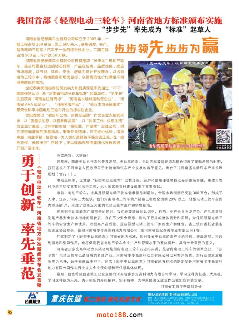 今年六月我們先后參加了常州、西安、沈陽的三個電動車新能源汽車的展會,感慨良多,也眼前一亮。在這個不為大城市所重視的,而面向城鄉市場的新產品,這些車子已經走進了許多百姓人家。一個新的行業正在掙脫政策的樊籬誕生出來,其中有不少我們摩托車配件企業也紛紛投入到這個行業——新能源車的產業。我們看到各種新能源代替傳統的汽油、普通蓄電池,鋰電池、太陽能及混合動力等車輛不斷的被開發出來。代表新能源汽車的標桿企業:特斯拉電動汽車,主動公開新能源汽車的專利,讓全世界人共享,這一舉措將大大提升新能源車的使用和推廣。我們國內從事生產和研發的企業已達五百多家,今年有關新能源專題的會議每個月基本有兩次以上。人民群眾蘊藏著巨大的創造力,而我們的管理者則往往是幼稚可笑,政策滯后,落后的生產關系,束縛著生產力的釋放,然而這是一個不可阻擋的潮流。今年7月我們新創刊《新能源車》這本雜志,目前正在編纂之中,將很快面世。這是一本目前國內最全面最新的新能源車的志,主要發布新能源汽車、新能源三輪車的信息,也可在www.moto189.com網站上在線閱讀。我們也會在主要省區建立完整的發行網絡,像我們摩托車配件雜志一樣,面向全部有關市場實行網絡化發行。目前新能源網站已正式上線,域名:www.moto189.com。同時,我們將參加下半年所有有關全國性和地方性的新能源展會。雜志板式為全彩105克銅版紙,大16K國際標準版,雜志印刷精美;全本雜志不以純廣告出刊,將有不少于五分之二的信息資訊內容發布。出刊后面向全行業贈送,歡迎大家索取,從明年后將以月刊的形式定期出刊。