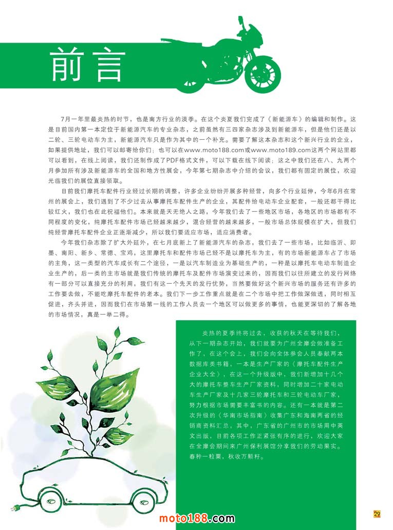 炎熱的夏季終將過去,收獲的秋天在等待我們,從下一期雜志開始,我們就要為廣州全摩會做準備工作了,在這個會上,我們會向全體參會人員奉獻兩本數據庫類書籍,一本是生產廠家的《摩托車配件生產企業大全》,在這一個升級版中,我們新增加十幾個大的摩托車整車生產廠家資料,同時增加二十家電動車生產廠家及十幾家三輪摩托車和三輪電動車廠家,努力根據市場需要豐富書的內容。還有一本就是第二次升級的《華南市場指南》收集廣東和海南兩省的經銷商資料匯總,其中,廣東省的廣州市的市場用中英文出版,目前各項工作正緊張有序的進行,歡迎大家在全摩會期間來廣州保利展館分享我們的勞動果實。春種一粒粟,秋收萬顆籽。