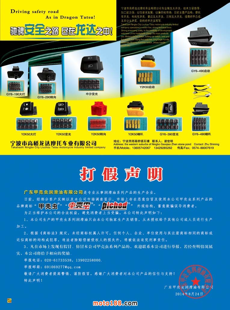全摩會(huì)還有2個(gè)多月就在廣州召開了,這次會(huì)上我們將奉獻(xiàn)給大家的是第12次升級(jí)的《中國摩托車配件生產(chǎn)企業(yè)大全》在這本書中。我們新增了目錄銷售排名前10-20名的摩托車整車生產(chǎn)企業(yè),二輪電動(dòng)車生產(chǎn)企業(yè)、燃油和電動(dòng)三輪生產(chǎn)企業(yè)的名錄,方便大家在增加經(jīng)營的同時(shí),有所選擇和參考。《華南市場(chǎng)指南》含廣東和海南兩省市場(chǎng)經(jīng)銷商戶的資料,其中的廣州白云區(qū)羅沖圍一帶的市場(chǎng)是用中英文雙語編排,方便外商的閱讀;其余例行的十一期雜志和外貿(mào)報(bào)紙;另外還有部分華東和西北地區(qū)的新的市場(chǎng)指南(已經(jīng)在南京和西安會(huì)議首發(fā))。如果有興趣從事新能源汽車業(yè)務(wù)的企業(yè)也可拿到《新能源車》雜志。這是我們新出的雜志,具體可去moto189網(wǎng)站上瀏覽到全部的內(nèi)容,在此不多贅述。記住廣州再見,帶上你的名片到1075展位領(lǐng)書去!