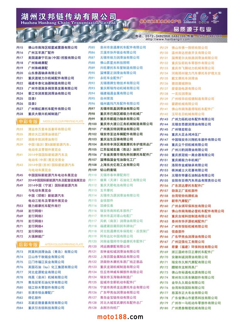 全摩會還有2個多月就在廣州召開了,這次會上我們將奉獻給大家的是第12次升級的《中國摩托車配件生產企業大全》在這本書中。我們新增了目錄銷售排名前10-20名的摩托車整車生產企業,二輪電動車生產企業、燃油和電動三輪生產企業的名錄,方便大家在增加經營的同時,有所選擇和參考?!度A南市場指南》含廣東和海南兩省市場經銷商戶的資料,其中的廣州白云區羅沖圍一帶的市場是用中英文雙語編排,方便外商的閱讀;其余例行的十一期雜志和外貿報紙;另外還有部分華東和西北地區的新的市場指南(已經在南京和西安會議首發)。如果有興趣從事新能源汽車業務的企業也可拿到《新能源車》雜志。這是我們新出的雜志,具體可去moto189網站上瀏覽到全部的內容,在此不多贅述。記住廣州再見,帶上你的名片到1075展位領書去!