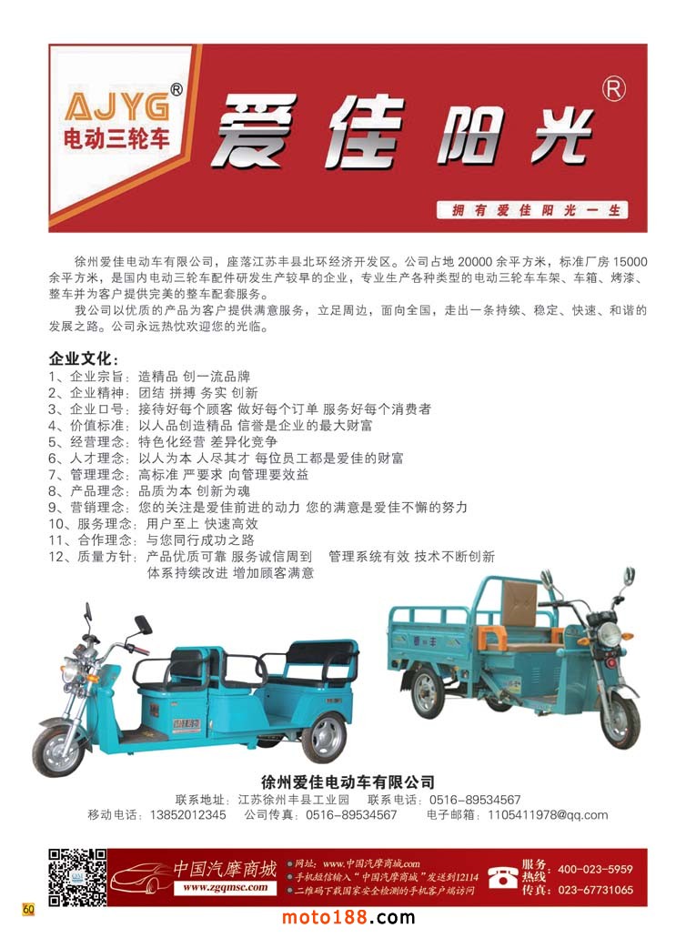 今年我們還針對一批以電動車配件和三輪車制造為主的地區和市場增加了雜志的發行和投放。比如無錫南方國際機電城是以電動車配件為主的市場,我們新設了發行點;比如豐縣是全國最大的三輪車生產基地,我們除進行雜志的投放外,還積極籌資成立辦事機構;類似如天津電動車配件城、偃師燃油三輪車配件一條街都將納入到我們的發行計劃之中。從今年第九期及本期雜志之后,我們近期計劃增加10個版的三輪車內容。將三輪車行業信息及時告知讀者,供大家在經營之中參考。這類行業相對于摩托車行業屬于新興的,與摩托車行業有很近的血緣關系,也可以說是摩托車行業派伸出來的,如果去摩托車配件市場,大家往往可以看到在市場的一角總有一些三輪車企業,停在露天待銷售的車輛,構成了市場里新的風景線。東隅已失,桑榆未晚。
