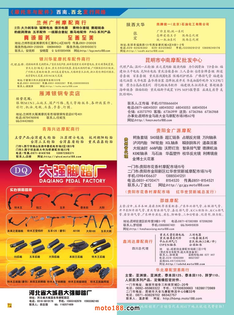 全摩會(huì)還有2個(gè)多月就在廣州召開了,這次會(huì)上我們將奉獻(xiàn)給大家的是第12次升級(jí)的《中國摩托車配件生產(chǎn)企業(yè)大全》在這本書中。我們新增了目錄銷售排名前10-20名的摩托車整車生產(chǎn)企業(yè),二輪電動(dòng)車生產(chǎn)企業(yè)、燃油和電動(dòng)三輪生產(chǎn)企業(yè)的名錄,方便大家在增加經(jīng)營的同時(shí),有所選擇和參考。《華南市場指南》含廣東和海南兩省市場經(jīng)銷商戶的資料,其中的廣州白云區(qū)羅沖圍一帶的市場是用中英文雙語編排,方便外商的閱讀;其余例行的十一期雜志和外貿(mào)報(bào)紙;另外還有部分華東和西北地區(qū)的新的市場指南(已經(jīng)在南京和西安會(huì)議首發(fā))。如果有興趣從事新能源汽車業(yè)務(wù)的企業(yè)也可拿到《新能源車》雜志。這是我們新出的雜志,具體可去moto189網(wǎng)站上瀏覽到全部的內(nèi)容,在此不多贅述。記住廣州再見,帶上你的名片到1075展位領(lǐng)書去!