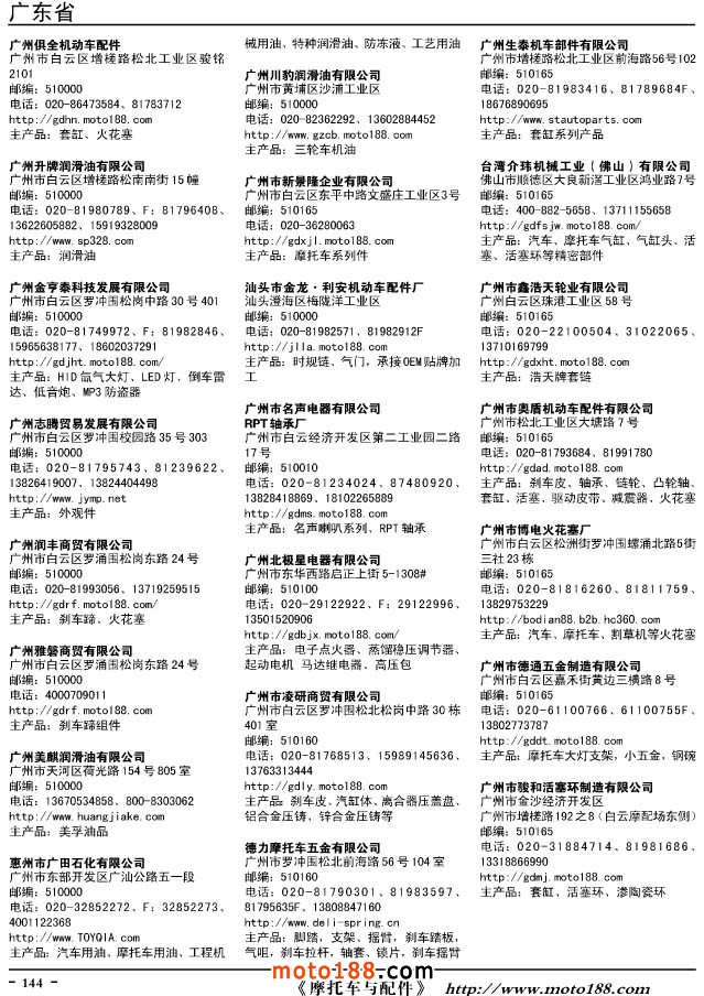 這兩年行業調整力度非常大,為了確保我們提供的信息準確性,我們本著寧缺毋濫的原則,不去圖虛的數量。目前摩托車與配件行業的不少經銷商是跨行業經營的,所以我們在本書中增加了部分摩托車整車廠、電動車生產廠、機動三輪車制造廠。所選的這些企業都是這個行業具有影響力的品牌企業,是為了大家在使用這本書時,獲取相關的延伸產業更多的實用信息。