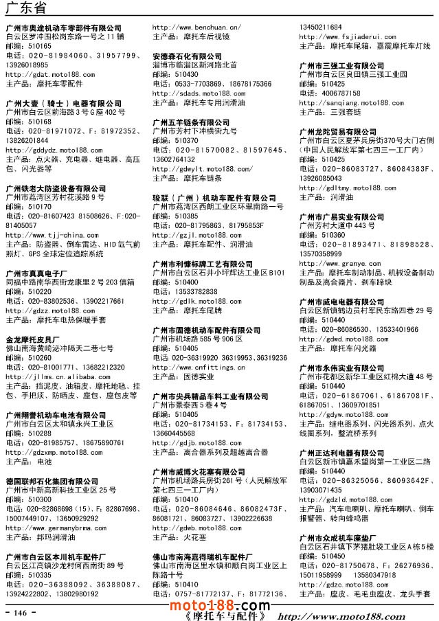 這兩年行業(yè)調(diào)整力度非常大,為了確保我們提供的信息準(zhǔn)確性,我們本著寧缺毋濫的原則,不去圖虛的數(shù)量。目前摩托車與配件行業(yè)的不少經(jīng)銷商是跨行業(yè)經(jīng)營的,所以我們在本書中增加了部分摩托車整車廠、電動車生產(chǎn)廠、機(jī)動三輪車制造廠。所選的這些企業(yè)都是這個(gè)行業(yè)具有影響力的品牌企業(yè),是為了大家在使用這本書時(shí),獲取相關(guān)的延伸產(chǎn)業(yè)更多的實(shí)用信息。