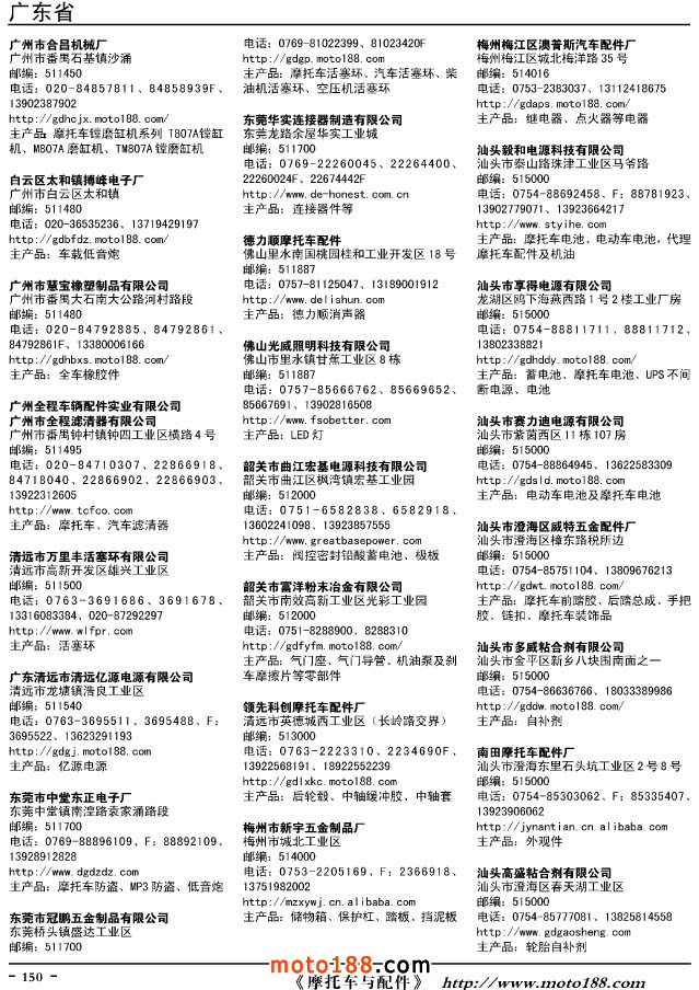 這兩年行業調整力度非常大,為了確保我們提供的信息準確性,我們本著寧缺毋濫的原則,不去圖虛的數量。目前摩托車與配件行業的不少經銷商是跨行業經營的,所以我們在本書中增加了部分摩托車整車廠、電動車生產廠、機動三輪車制造廠。所選的這些企業都是這個行業具有影響力的品牌企業,是為了大家在使用這本書時,獲取相關的延伸產業更多的實用信息。