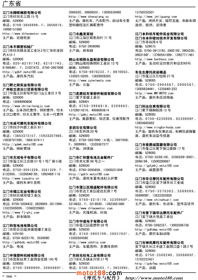這兩年行業調整力度非常大,為了確保我們提供的信息準確性,我們本著寧缺毋濫的原則,不去圖虛的數量。目前摩托車與配件行業的不少經銷商是跨行業經營的,所以我們在本書中增加了部分摩托車整車廠、電動車生產廠、機動三輪車制造廠。所選的這些企業都是這個行業具有影響力的品牌企業,是為了大家在使用這本書時,獲取相關的延伸產業更多的實用信息。